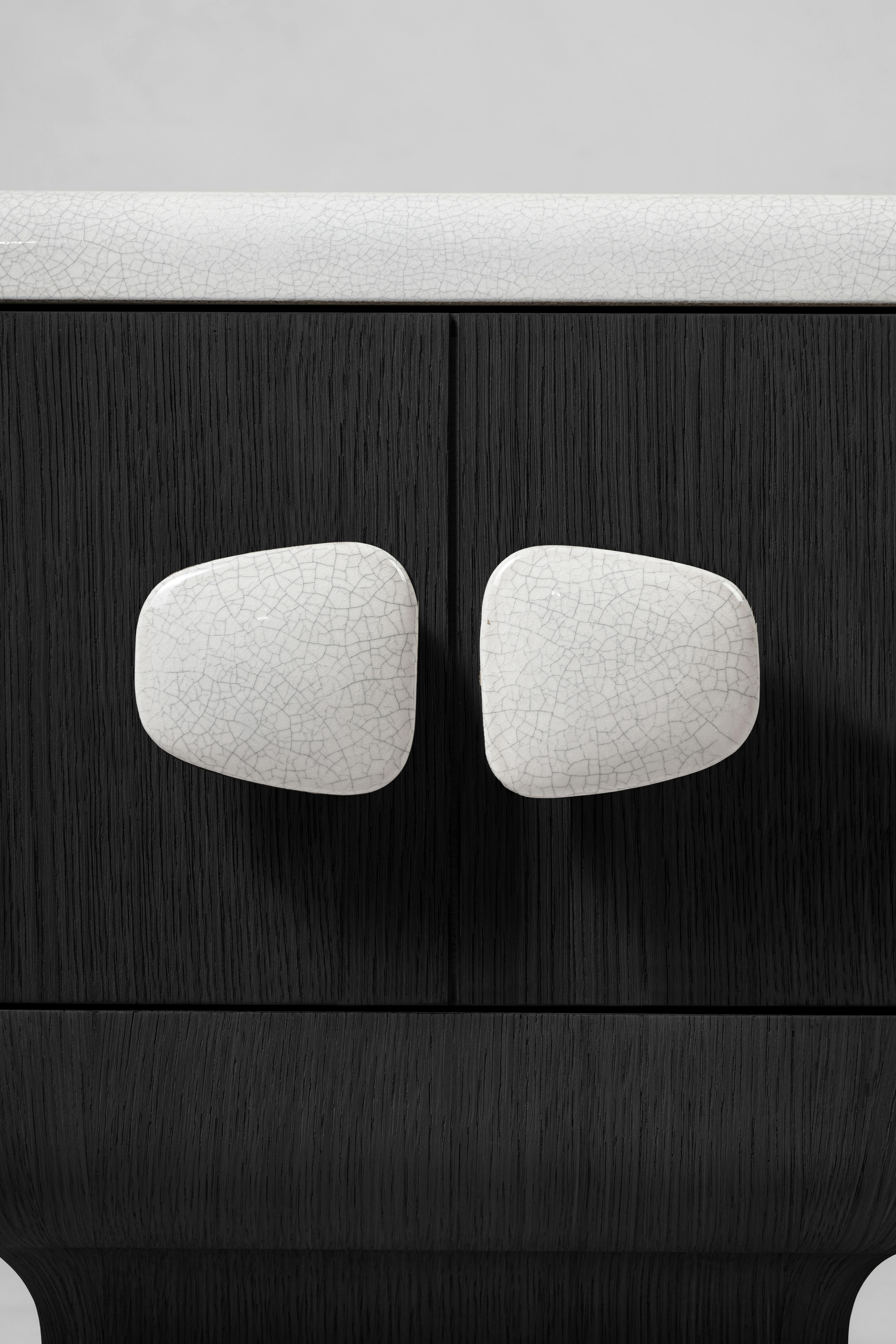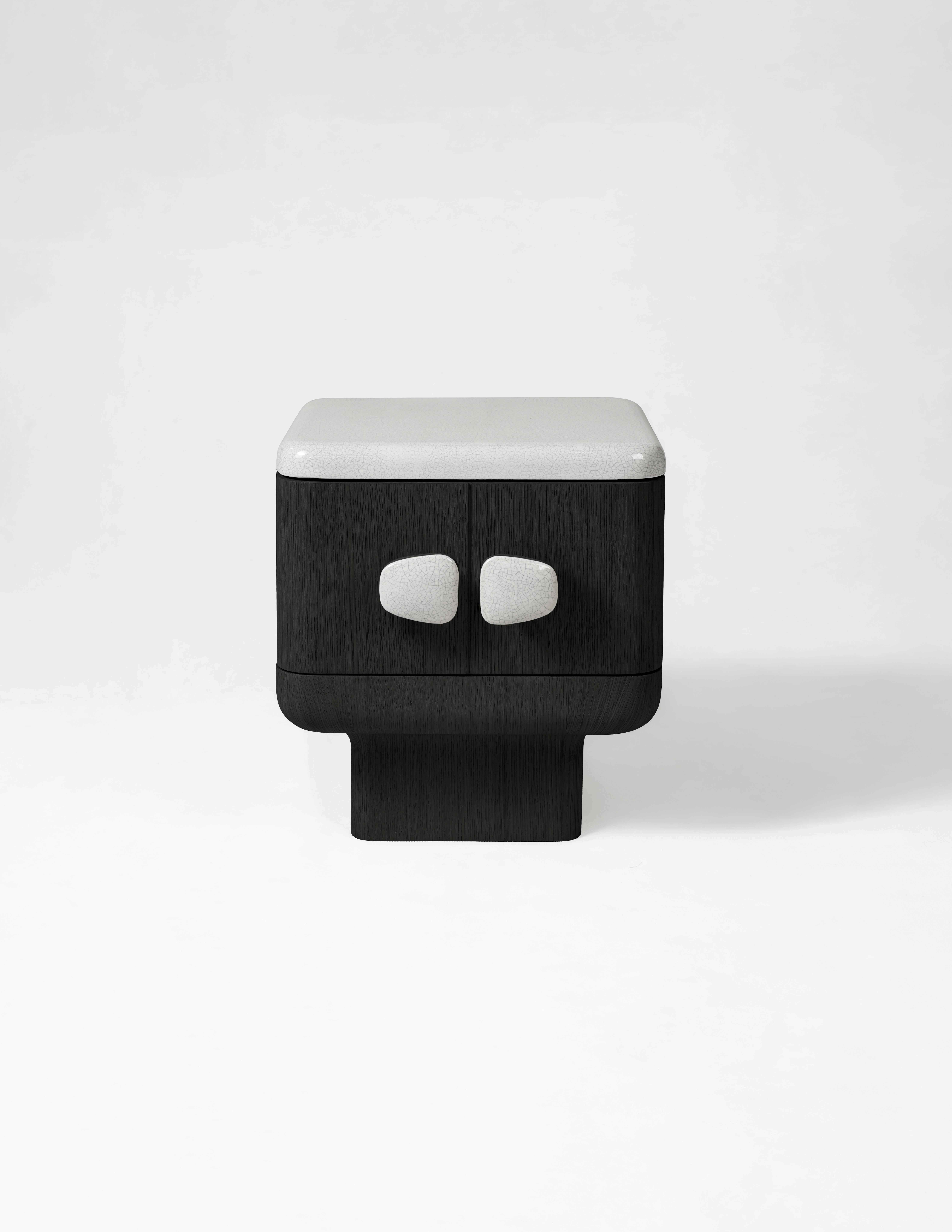 Side table pictured in natural oak with handles and tabletop in raku blanc écru.