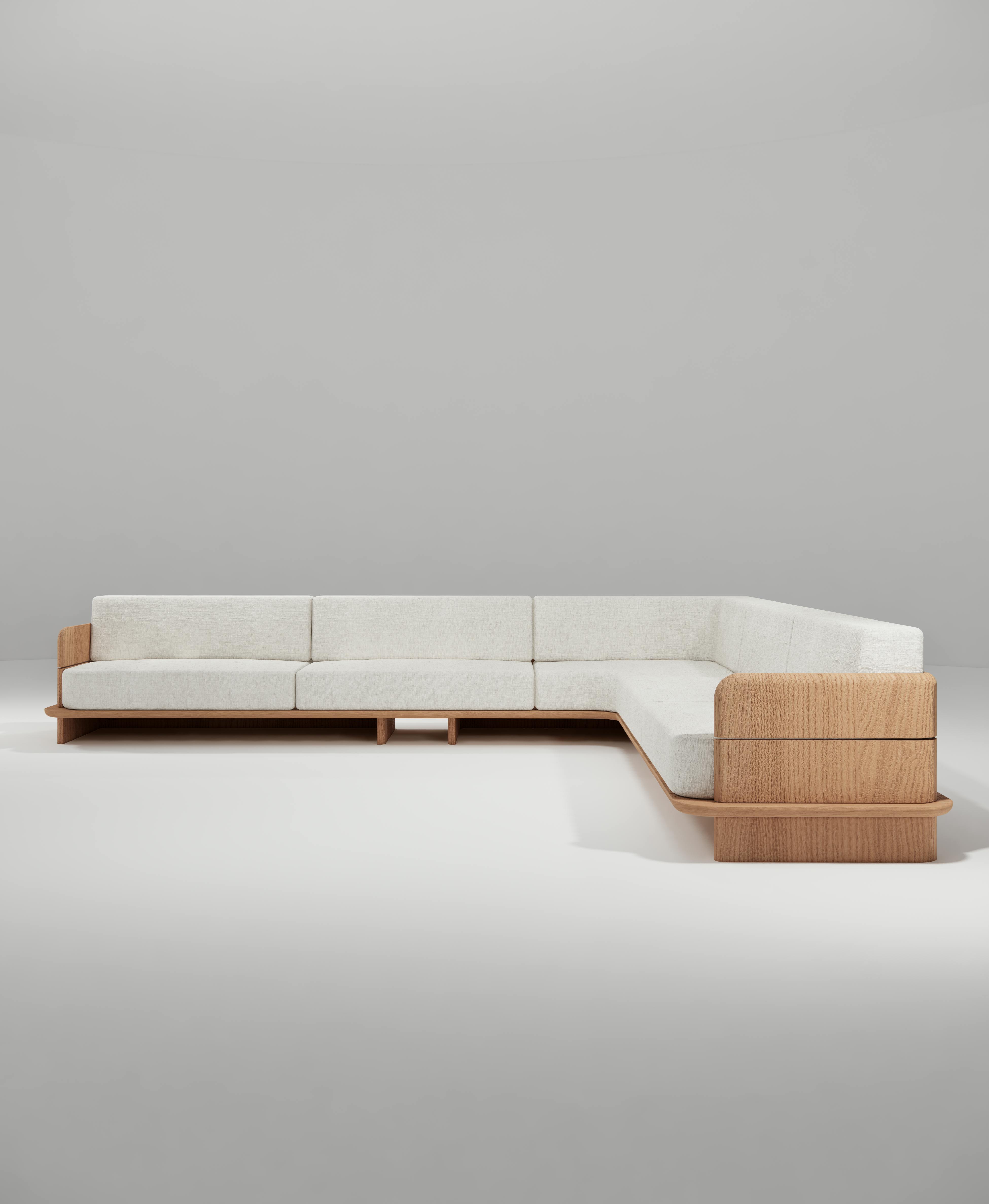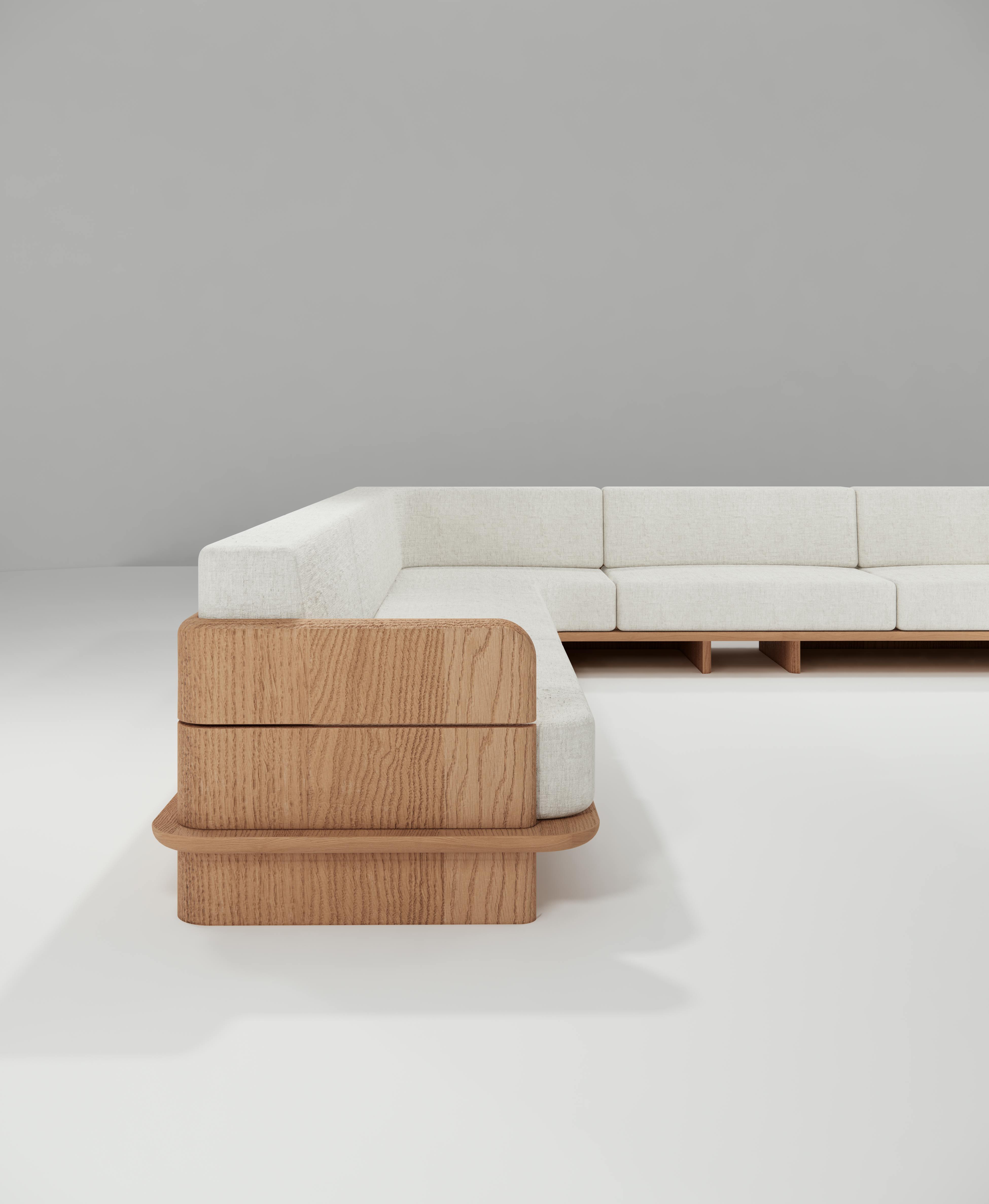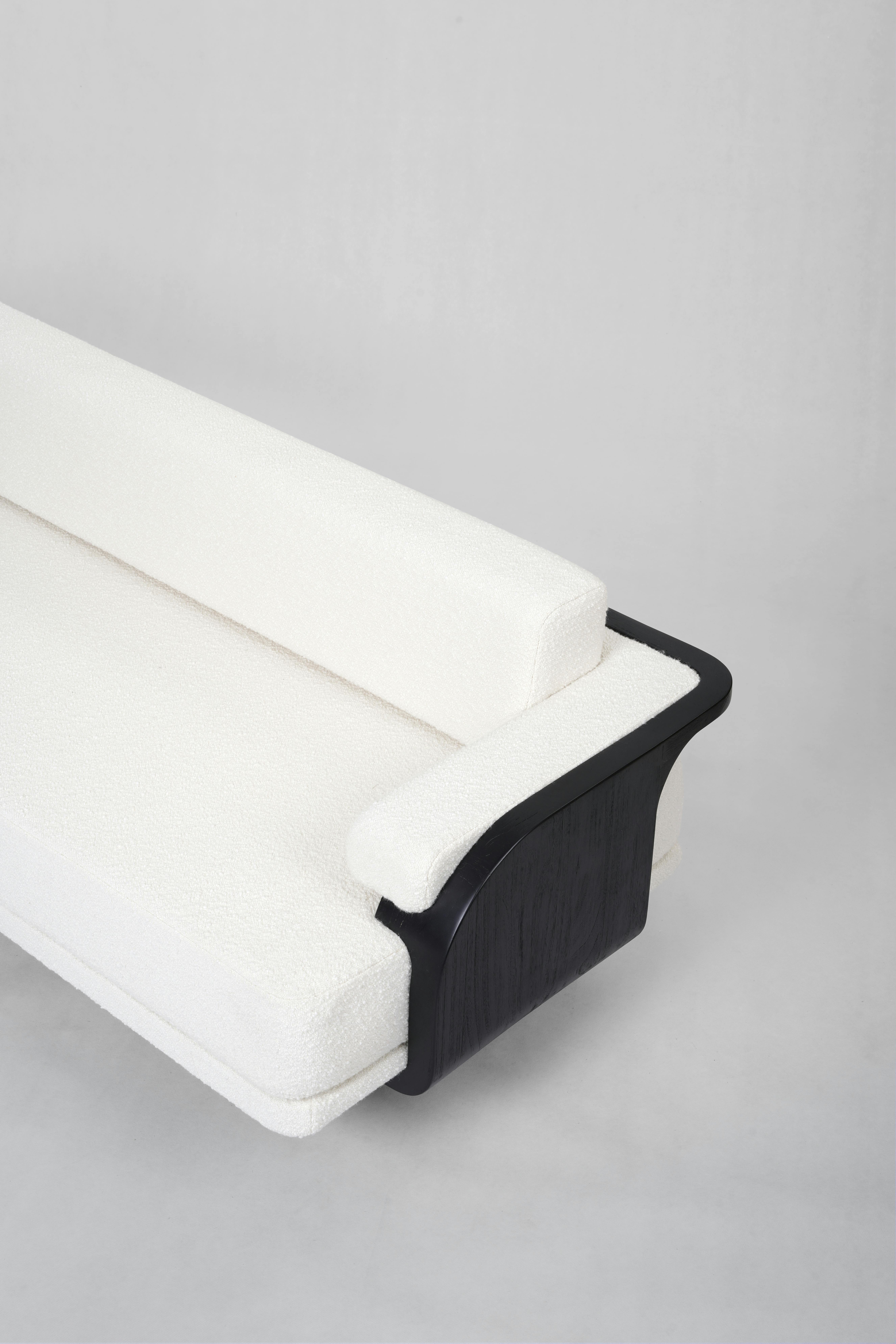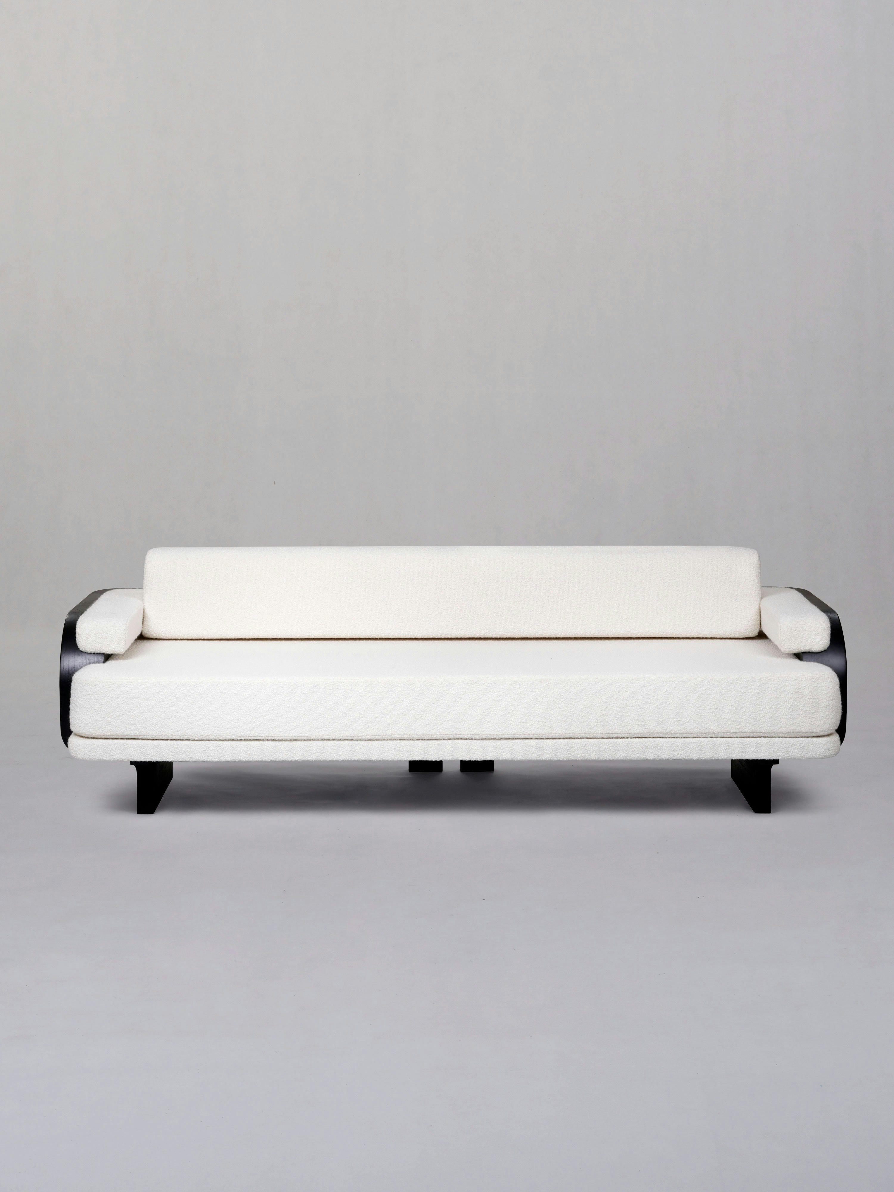 Sofa pictured in black teak and upholstered with Schumacher Margarete Boucle Ivory.