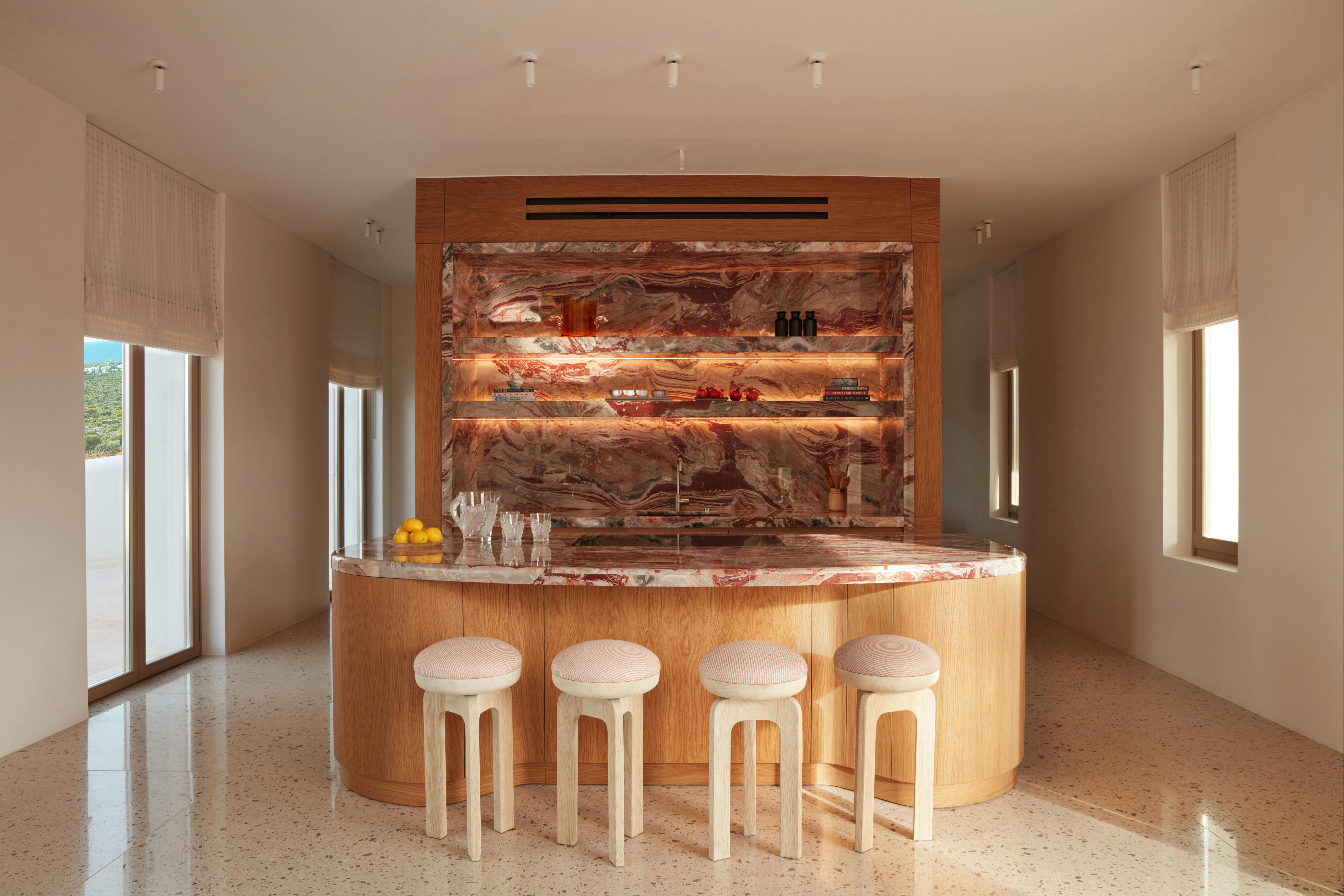 Stool pictured in white-washed oak. The seat is upholstered with Shoreline Stripe by Schumacher.