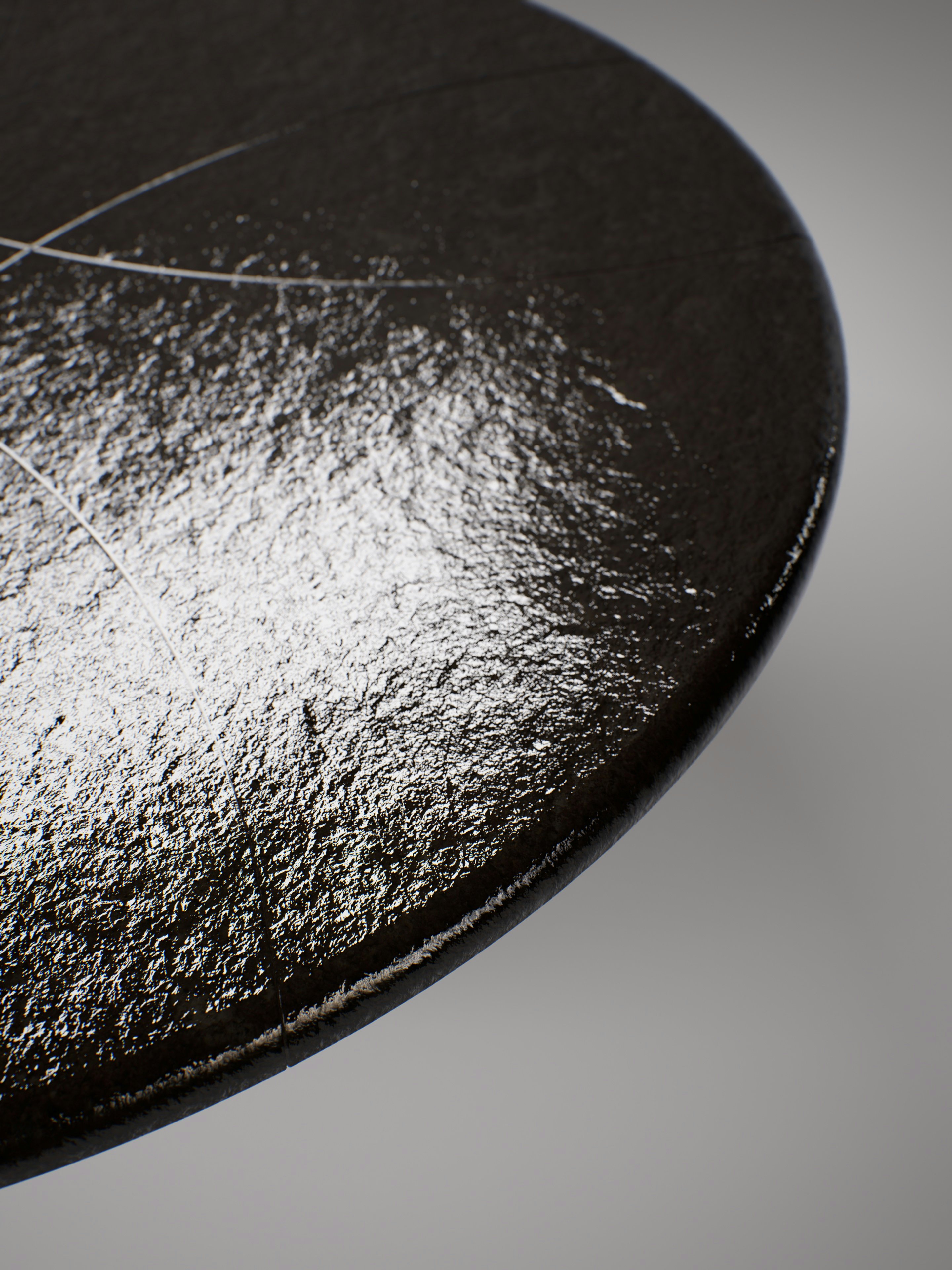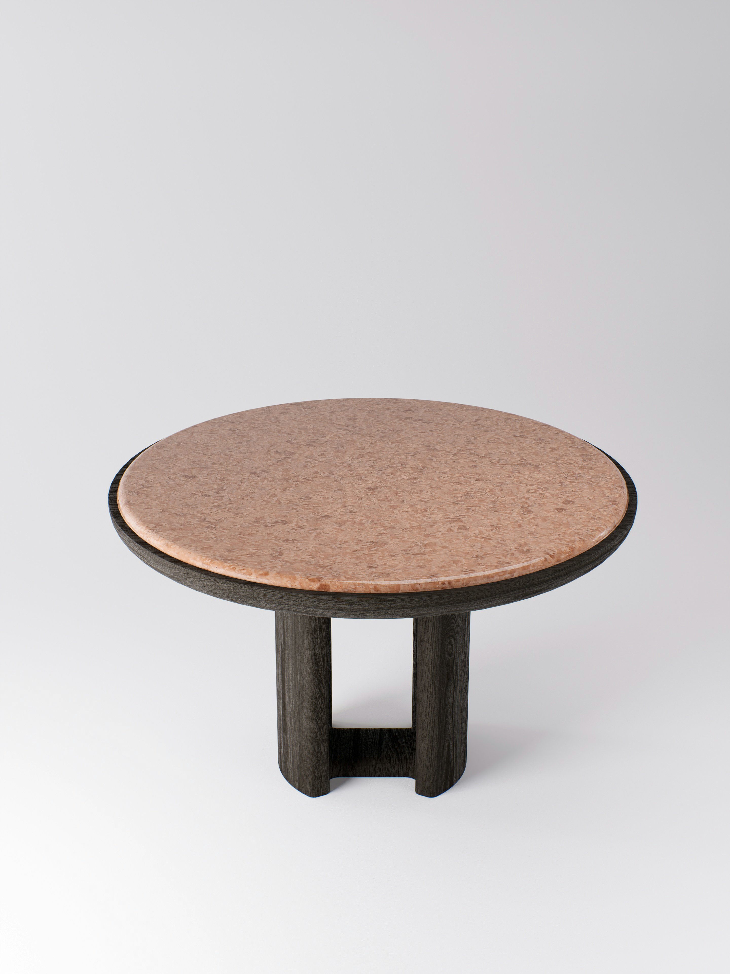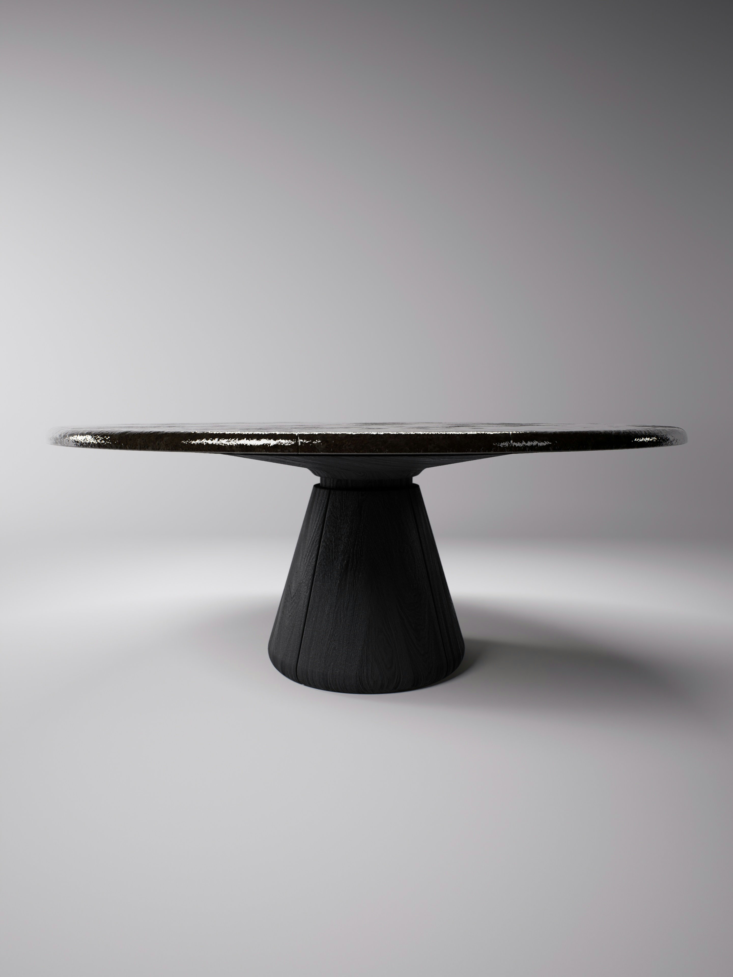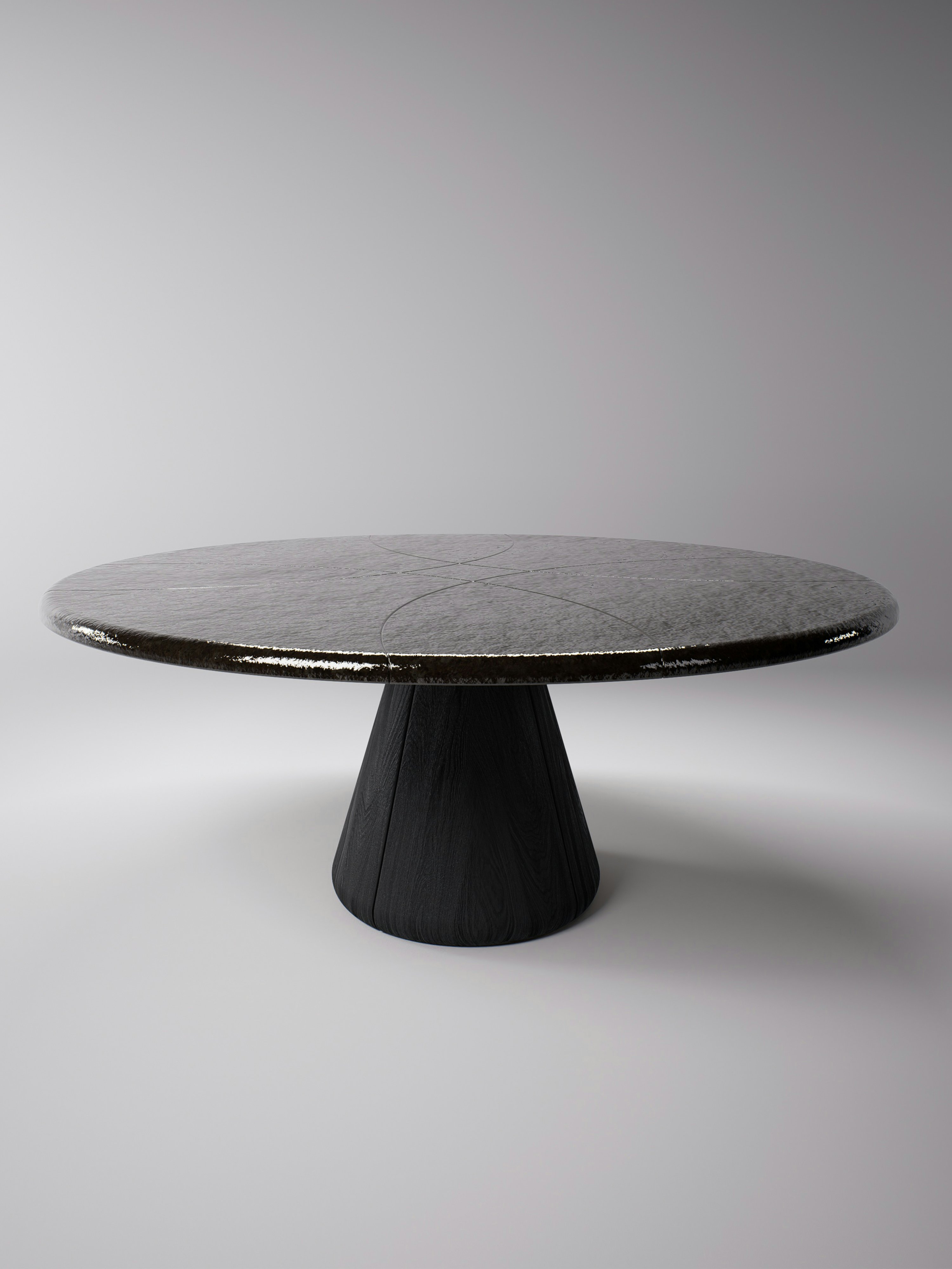 Circular dining table pictured in black teak with a black crème brûlée lava stone tabletop.