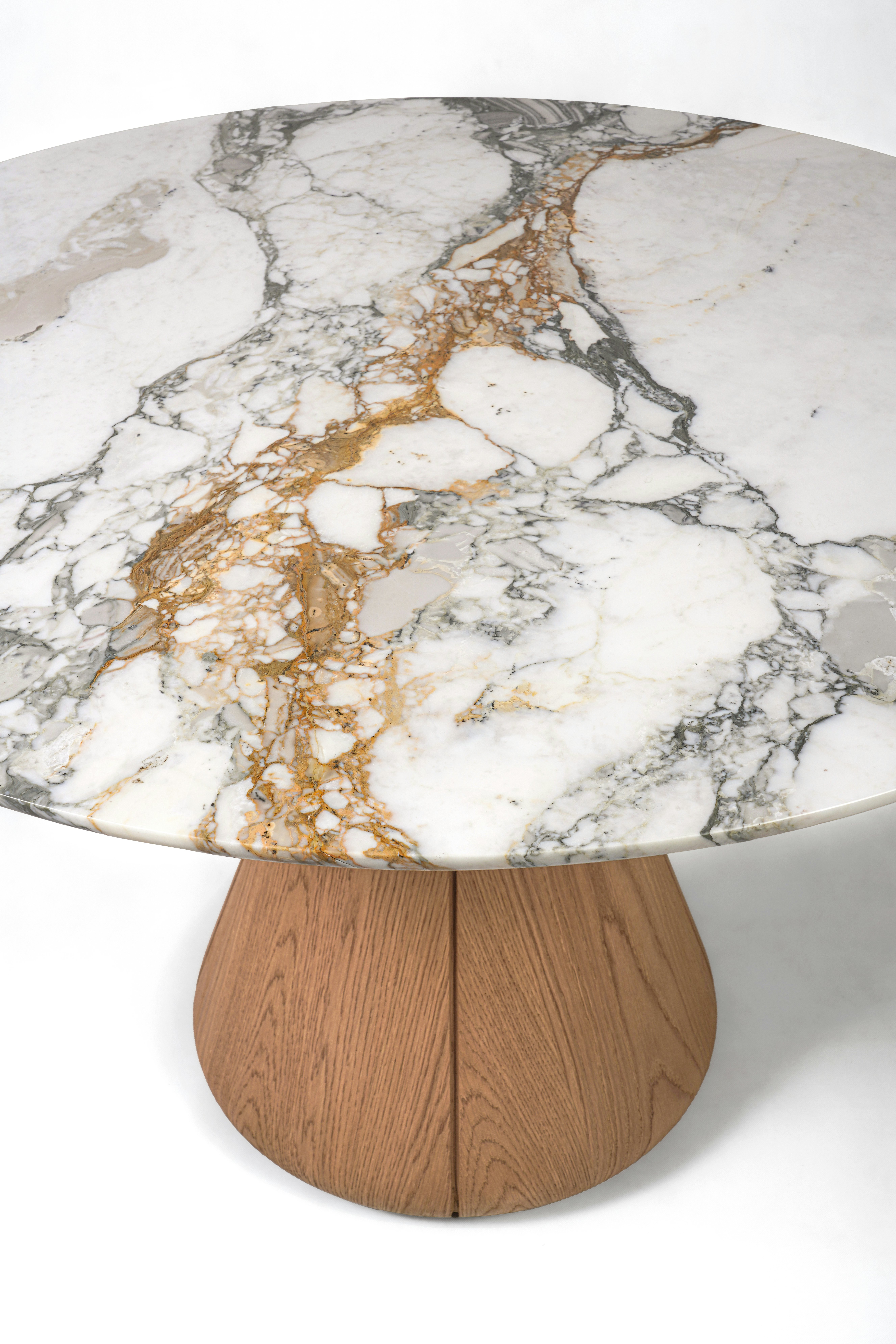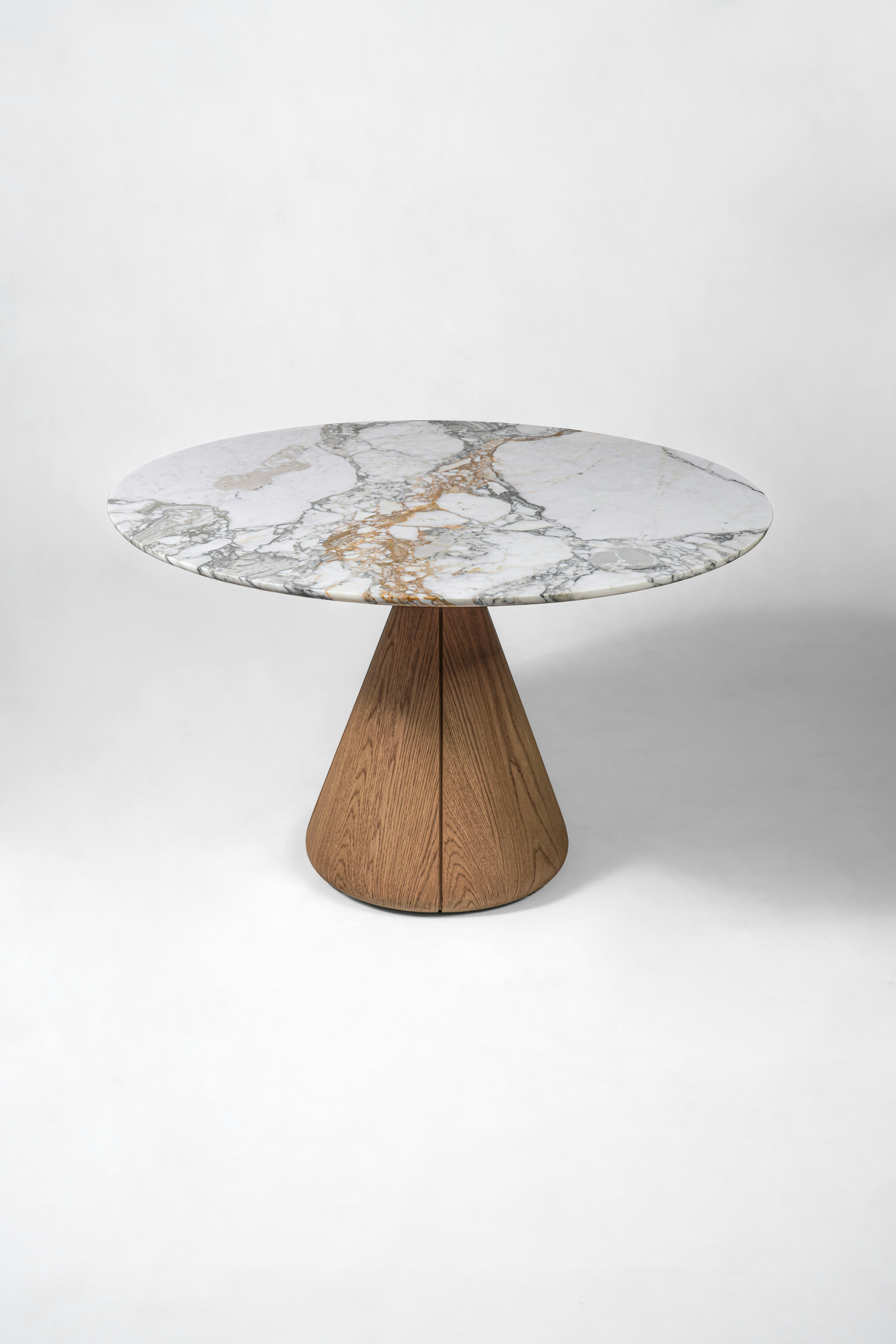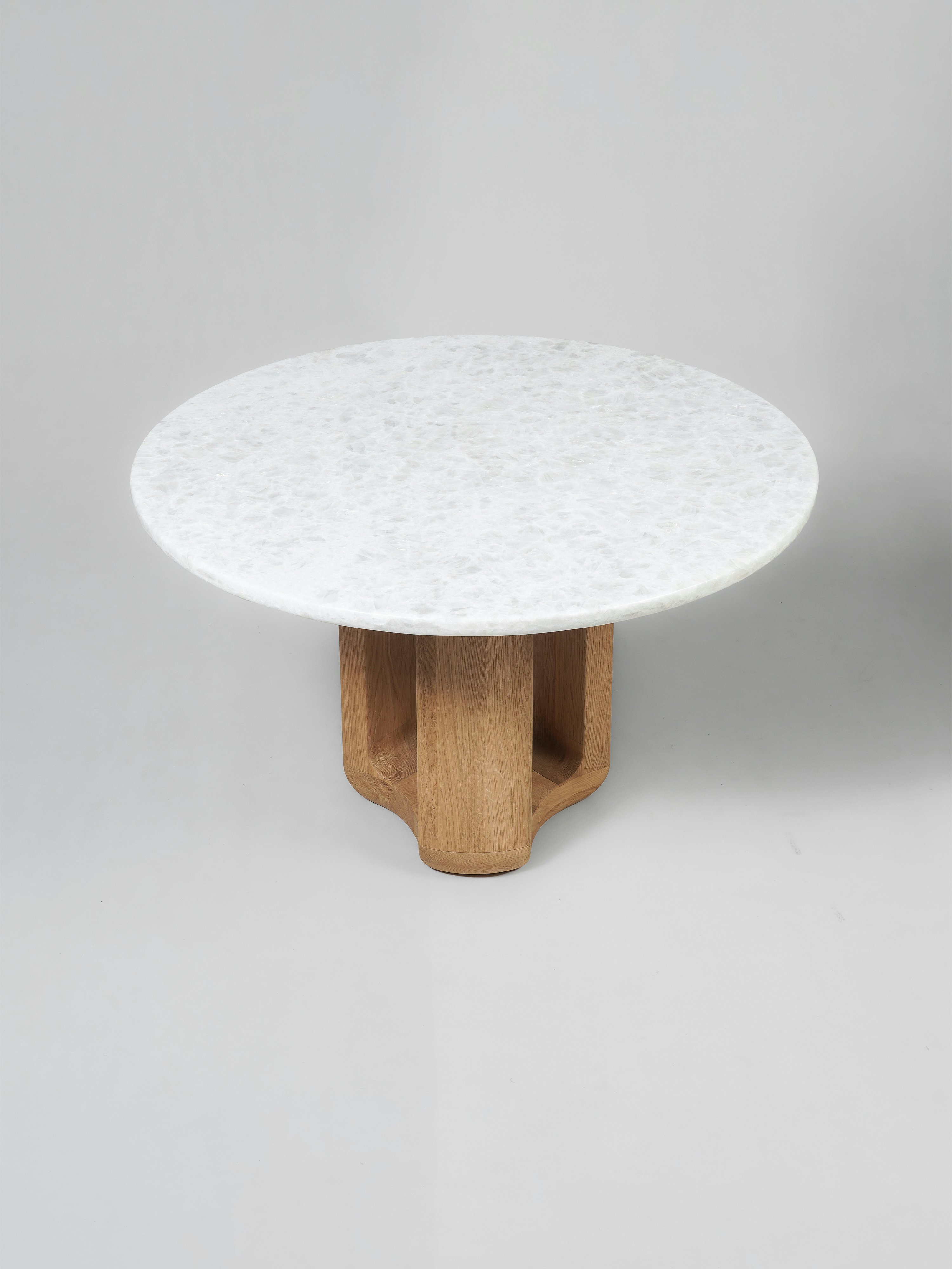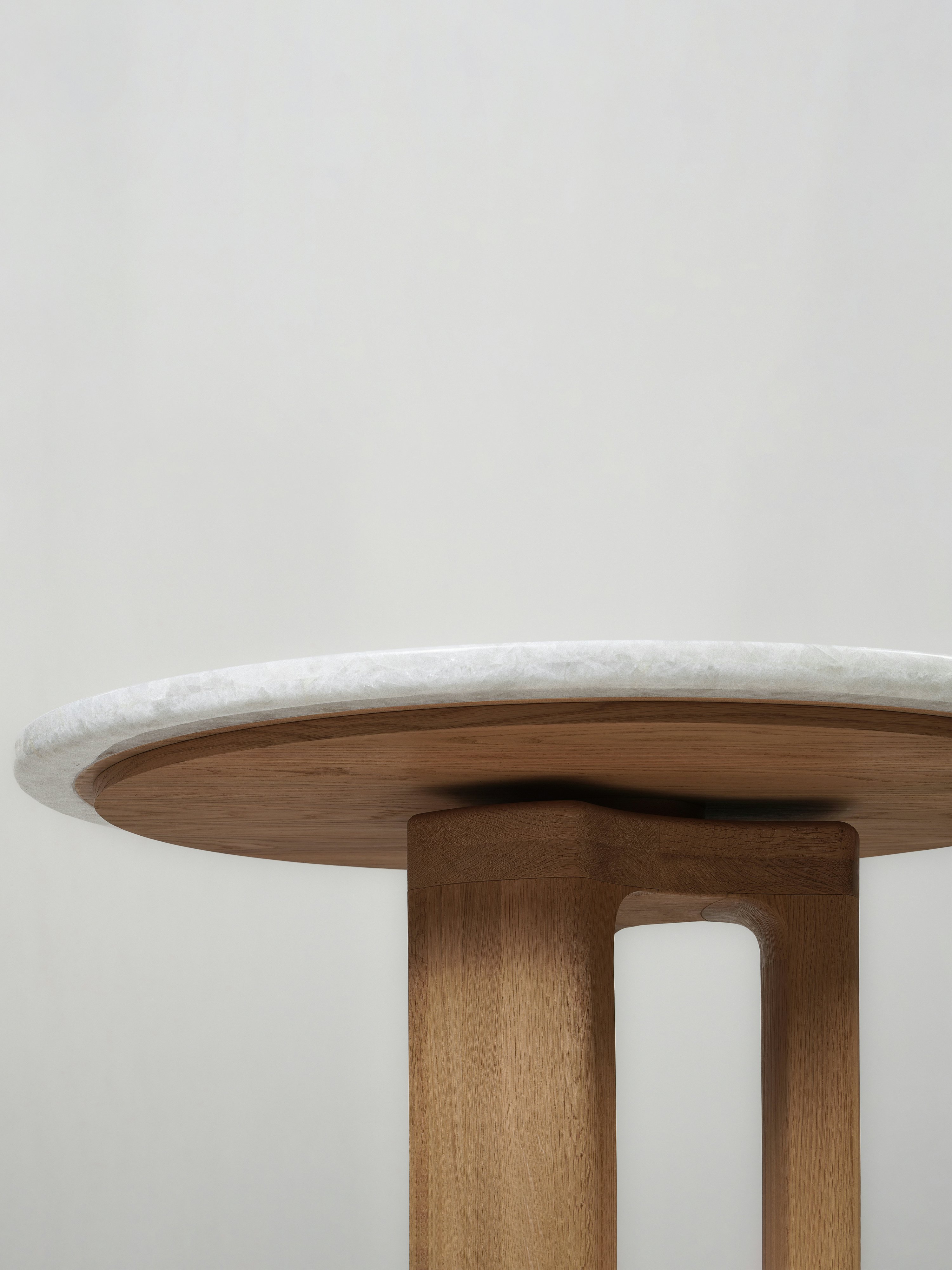 Circular dining table pictured in black teak with a black crème brûlée lava stone tabletop.