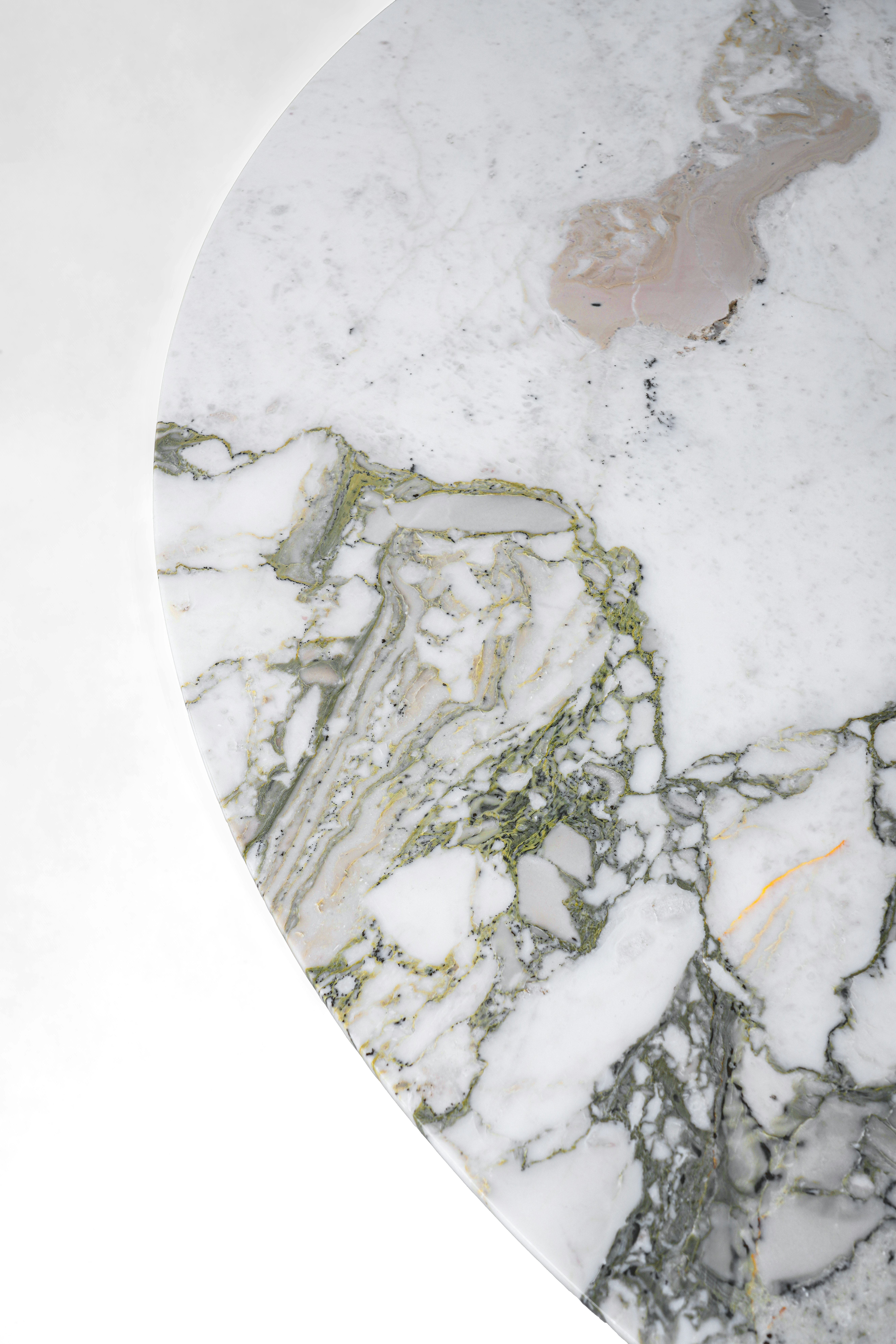 Circular dining table pictured in natural oak with a Calacatta marble tabletop.