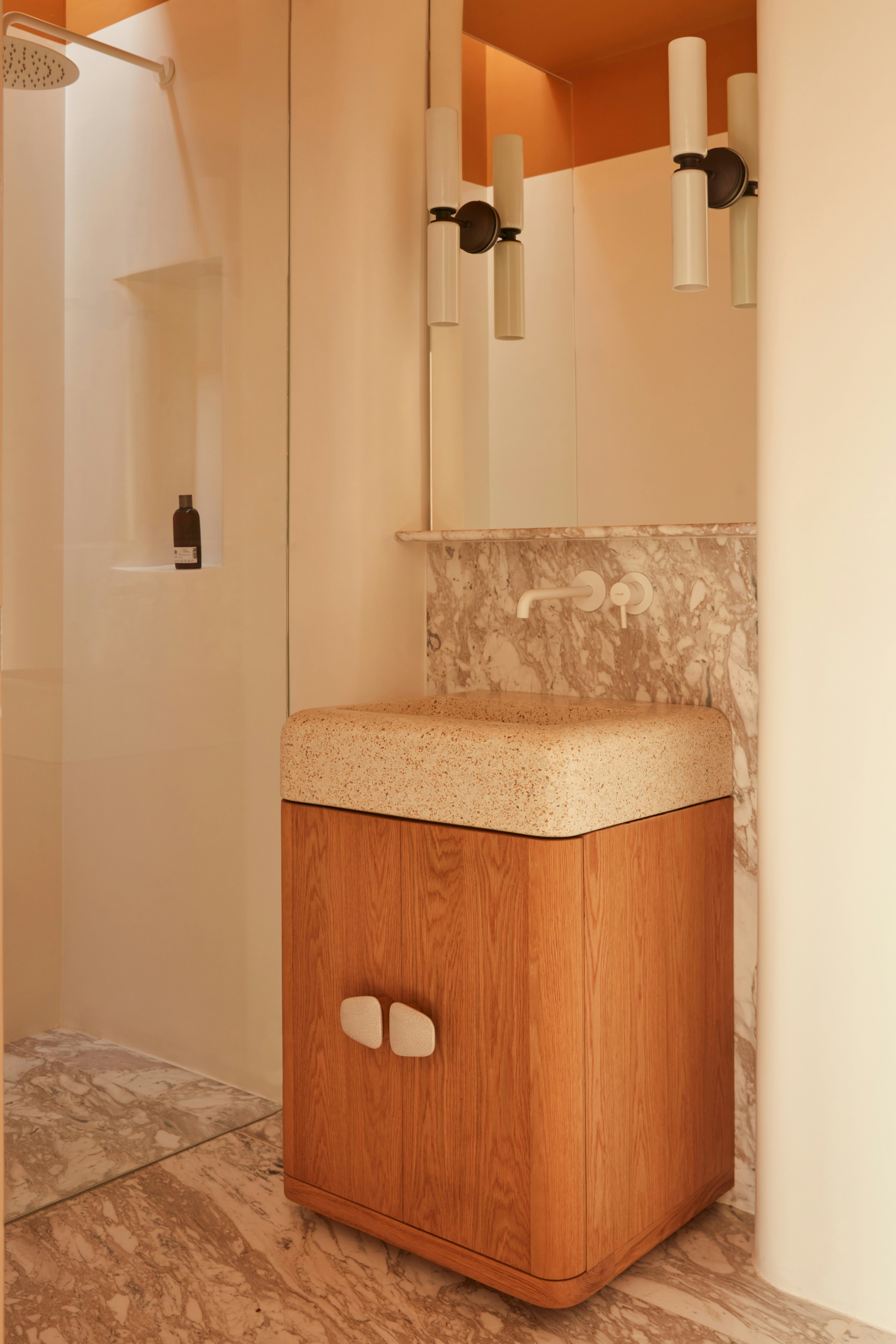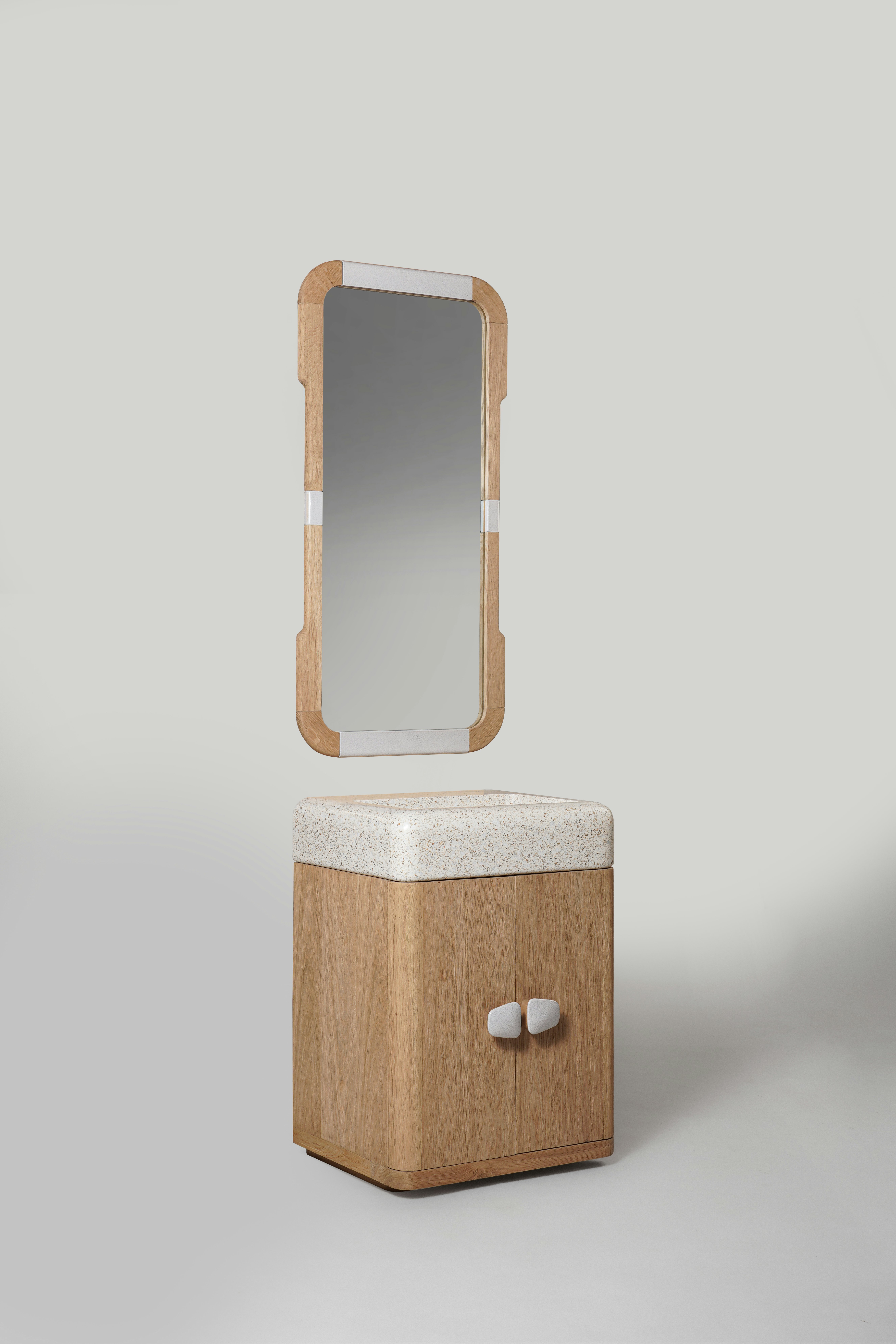 Vanity sink pictured in natural oak with a terrazzo sink and full glazed crackle handles.