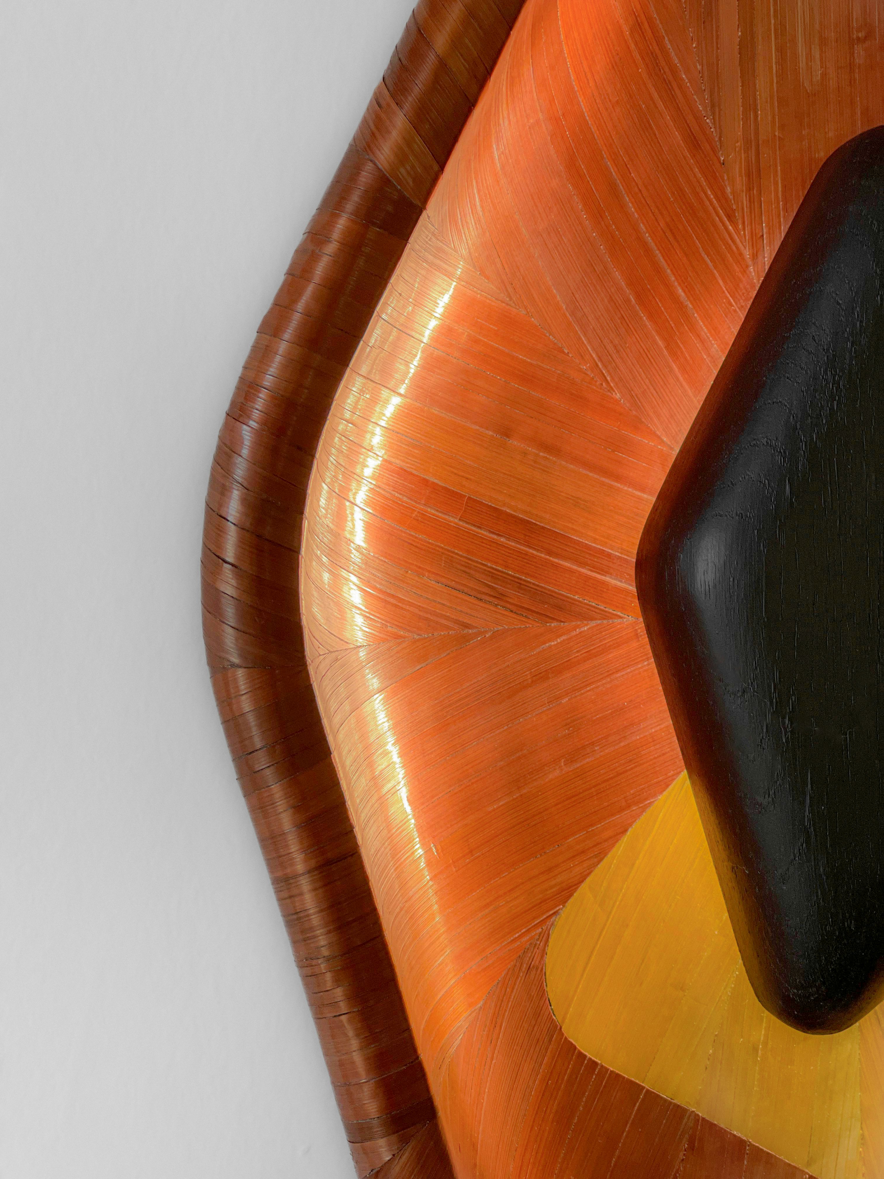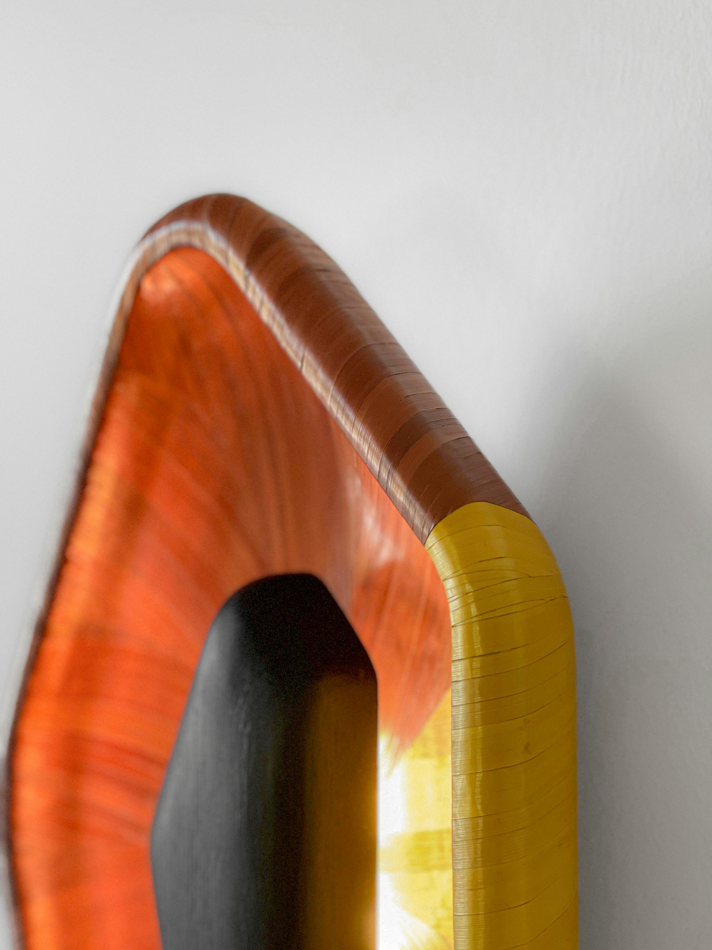 Satara wall light pictured in red and yellow straw marquetry with a center in hand-brushed black oak.